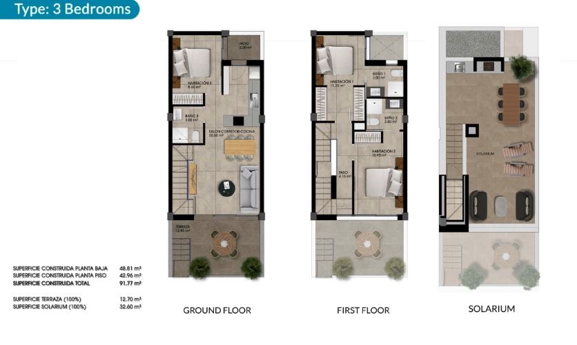 This semidetached property in Dolores is currently under construction, offering modern living spaces in a convenient location. The home covers a total of 134 m2 with an 87 m2 house area and features three bedrooms and three bathrooms. The living room spans 29 m2, providing a comfortable space for relaxation. The property includes both a terrace (14 m2) and a rooftop terrace (30 m2), perfect for enjoying the outdoors. Conveniently situated within walking distance to restaurants and shops, the location provides easy access to essential amenities. The property is also south-facing, adding a pleasant natural light to the home. House features include a luxury open-plan kitchen with some appliances included, and pre-installed air conditioning for comfort. Internet connectivity is available through optic fiber, ensuring a reliable online experience. Additionally, there's a communal garden, adding a green touch to your surroundings. Community features enhance this living experience with access to a communal swimming pool for leisurely afternoons in the sun. This property is an ideal choice for those seeking modern design coupled with urban convenience in the sunny Dolores area.