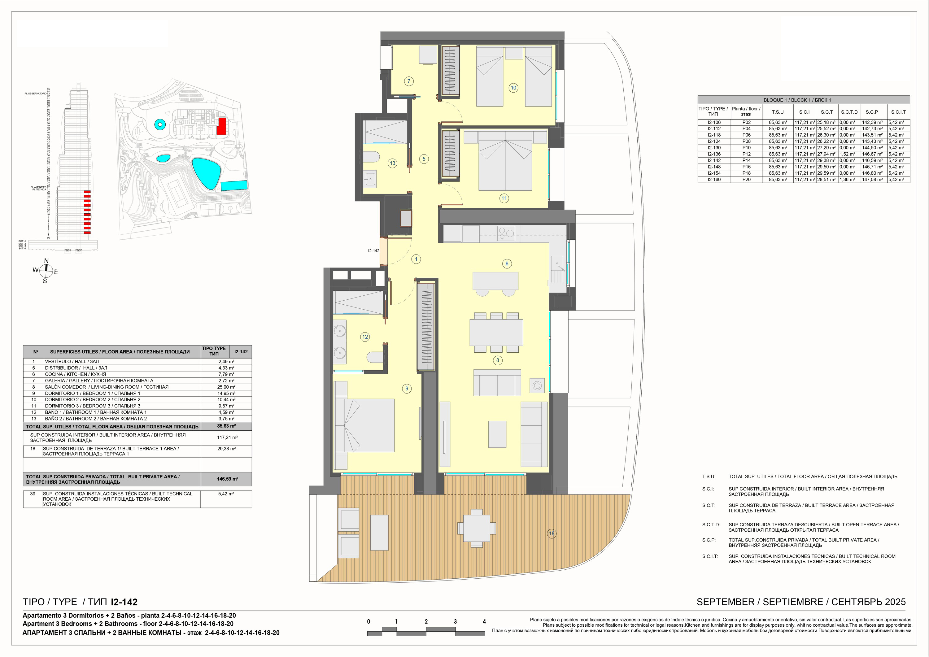 A striking new landmark is about to reshape the skyline of Benidorm: a 64-floor residential tower located just 150 meters from the golden sands of Poniente Beach. This iconic building not only offers contemporary homes with sea views but also a unique lifestyle experience, with world-class facilities reserved for residents. Highlights of the building include a skybar on the 63rd floor with panoramic views over the Mediterranean, a complete spa with saunas and an indoor pool on the 22nd floor, and extensive outdoor areas featuring several swimming pools (including heated), sports courts, tennis courts, and children’s play zones. On the 21st floor, residents will find a professional gym, yoga garden, and a dedicated kids club. The Apartment: This corner unit on the 10th floor benefits from an abundance of natural light and wide views: Build area: 117 m² + 27 m² of terraces. Living room: 32.79 m² open-plan living area with direct access to the terrace. Terrace: 29.38 m², ideal for dining and relaxing outdoors. Bedrooms: Three bedrooms, including a spacious master suite of 19.54 m². Bathrooms: Two modern bathrooms, one en-suite. Orientation: Corner layout for extra light and views. Parking: A private space in the underground garage is included. This apartment is part of one of the most anticipated new developments on the Costa Blanca, combining prime beachside location with outstanding facilities and design.