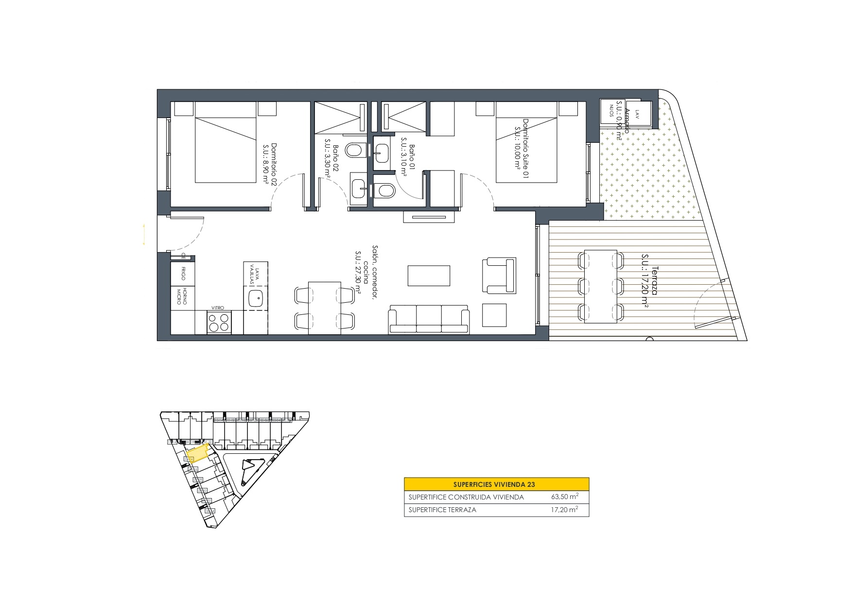 This new apartment in San Fulgencio is currently under construction, offering a unique place to call home. With a built area of 81 m2, it includes a spacious living room of 27 m2, providing ample space for family gatherings or relaxation. The apartment features two bedrooms and two bathrooms, making it suitable for both families and guests. It boasts a terrace area of 17 m2, perfect for enjoying the local climate. Additionally, a beautiful garden spanning 17 m2 provides a pleasant view and a serene outdoor space. Featuring pre-installed air conditioning, some included appliances, and heating by air conditioning, this property is designed for comfort. The communal swimming pool offers a refreshing retreat, while the location within walking distance to restaurants and shops adds to the convenience.