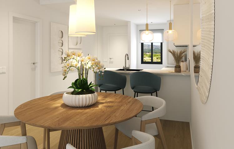 The apartment is under construction in Alfaz del Pi, offering two bedrooms and two bathrooms spread over a comfortable house area of 63 m2. The living room spans 28 m2, making it a spacious area for relaxation and entertainment. The apartment includes a luxury open-plan kitchen, with some appliances provided, and pre-installed air conditioning for heating and cooling needs. A large terrace with an area of 24 m2 offers additional space to enjoy the outdoors, particularly pleasant given the south-facing orientation. The property also features a private garden of 45 m2 to unwind and enjoy green surroundings. With optic fiber internet connection available, staying connected is hassle-free. The location is convenient, with restaurants and shops within walking distance. Residents can also benefit from the communal swimming pool, providing leisure and relaxation opportunities.