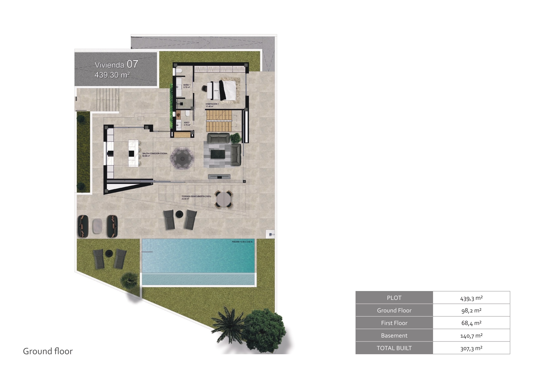 This stunning villa is currently under construction in the picturesque town of Polop. Designed with modern living in mind, it offers a spacious living room that spans 63 m2, perfect for entertaining or a relaxing family night. The property covers a total house area of 165 m2 and features a generous terrace of 24 m2. The villa boasts three comfortable bedrooms and three bathrooms, in addition to a guest toilet. The terrace area provides the perfect outdoor space to enjoy the surrounding area. The villa's south-facing orientation enhances its bright interiors, creating a welcoming atmosphere. Conveniently situated within walking distance to restaurants and shops, you’ll have everything you need close by. Set on a plot of 366m2, with a luxurious infinity pool measuring 3x10 m, this villa also includes a beautifully landscaped garden. The spacious basement area of 141 m2 allows for additional storage or use as desired. The luxury kitchen is equipped with some appliances, complemented by air conditioning and heating for year-round comfort. Its proximity to the beach, just 15 minutes away, further enhances its appeal. The property is well-connected, with an underground parking space and an optic fiber internet connection.