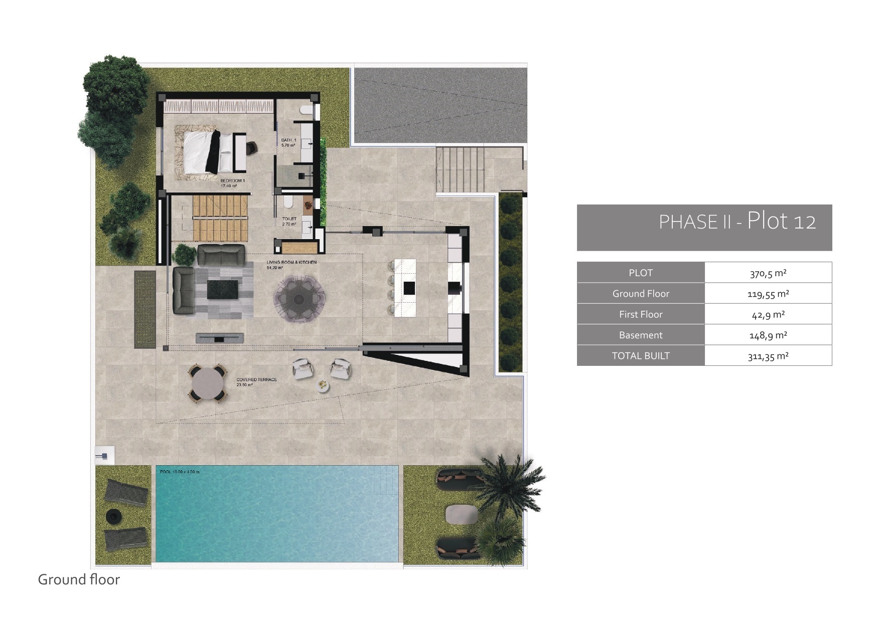 This beautiful villa in Polop is currently under construction and offers a perfect blend of luxury and comfort. Spanning across 335 m2 with a house area of 311 m2, this new building features three spacious bedrooms and three bathrooms, along with an additional guest toilet. The villa is thoughtfully designed with a generous living room area of 54 m2, ideal for family gatherings or entertaining guests. The property includes a terrace space of 24 m2, perfect for enjoying the sunny climate. The villa's south-facing orientation ensures abundant natural light throughout the day. Furthermore, it features a private infinity pool measuring 4x10 m, set harmoniously within a plot size of 371 m2. The luxury, open-plan kitchen is fitted with some included appliances and optic fiber internet connection guarantees excellent connectivity. For added convenience, there's an underground parking space and a basement area of 148 m2. Perfectly situated, the villa is within walking distance of restaurants and shops. It is just a 15-minute drive to the beach and 35 minutes from the airport. The presence of a garden and efficient air conditioning systems provide additional comfort in this well-located property in the sunny region of Polop.